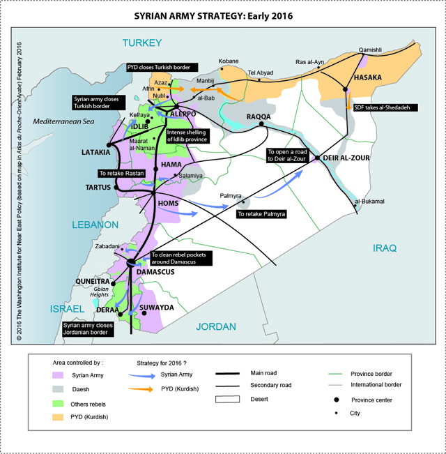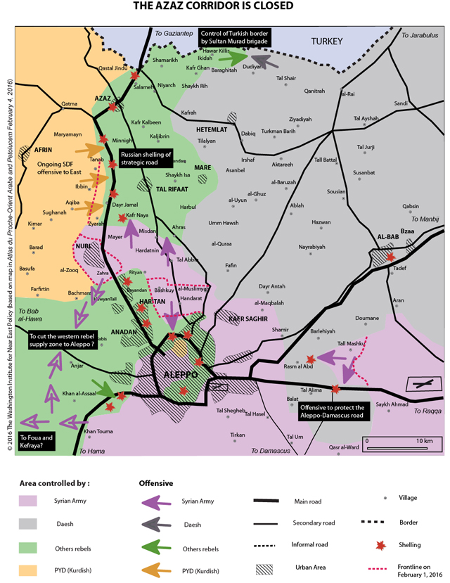 متاح أيضاً في English 5 شباط/فبراير 2016 في 2 شباط/فبراير، نجح الجيش السوري وحلفاؤه في قطع الطريق الشمالية بين مدينة حلب وتركيا والمعروفة بممر أعزاز. وعلى الرغم من أن المعركة كانت عملية محلية شارك فيها عدد صغير نسبياً من المقاتلين، إلا أنها قد تشكّل نقطة تحول في الحرب السورية. وهذا التطور الأخير لا يهدد وجود المتمردين في محافظة حلب فحسب، بل قد يضع الحدود التركية السورية المشتركة بأكملها تحت سيطرة القوات الموالية للأسد في غضون أشهر، أو يدفع القوات الكردية المتواجدة في المنطقة إلى تبنّي خيار التعايش مع الأسد. قطع الممر الشمالي انطلقت العملية العسكرية للسيطرة على ممر أعزاز من باشكوي (الضاحية الشمالية لحلب) ومن موقع تمركز الشيعة الموالين للنظام في بلدتي نبل- الزهراء. ويشارك «حزب الله» وميليشيتان شيعيتان مدعومتان من إيران - «كتائب بدر» العراقية وميليشيا «الدفاع الوطني» المحلية - كوحدات أساسية في المعركة على الأرض، وتواجه [هذه الوحدات] القوات المتمردة بقيادة «جبهة النصرة» التابعة لتنظيم «القاعدة»، والتي كانت قد أرسلت في السابق المئات من التعزيزات من منطقة إدلب. يكمن الهدف الأول للمقاتلين الشيعة في رمزية الانتصار، أي الدفاع عن أبناء طائفتهم الشيعة ضد الإسلاميين السنّة الذين يريدون طردهم. وقد قاوم الموقع الصغير في نبل-الزهراء اعتداءات المتمردين طوال ثلاث سنوات فيما كان «حزب الاتحاد الديمقراطي» الكردي يحمي الجانب الغربي ويسمح بدخول إمدادات الغذاء إليه. وفي المقابل، كان الجيش السوري يحمي حي الشيخ مقصود الكردي في حلب من اعتداءات المتمردين. أما التعاون غير المباشر بين «حزب الاتحاد الديمقراطي» والجيش السوري فقد أصبح الآن تعاوناً مباشراً في وقت تشن فيه قواتهما هجمات ضد المتمردين في ممر أعزاز. وفي شباط/فبراير 2015، فشلت محاولة لضم موقع نبل-الزهراء مع المنطقة الخاضعة لسيطرة الحكومة بشكل مأساوي بسبب النقص في الاستعدادات ووجود قوات غير كافية. وبعد ذلك، شنت القوات المتمردة هجوماً مضاداً واسعاً وسيطرت على إدلب ثم هددت حلب وحتى اللاذقية. واضطر بشار الأسد إلى طلب التدخل من روسيا دون أي شروط. وفي المقابل، جاء الهجوم الأخير بعد أسابيع من القصف الجوي الكثيف ضد دفاعات المتمردين، لا سيما على مركز باب السلام الحدودي مع تركيا الذي كان المتمردون يحصلون من خلاله على الكثير من امداداتهم. ولا يبلغ عرض الممر الذي تسيطر عليه المعارضة بين حلب وتركيا سوى خمسة إلى خمسة عشر كيلومتراً، وينحصر بين قوات تنطيم «الدولة الإسلامية» شرقاً وإقليم عفرين الكردي غرباً. أمّا الجماعات المتمردة الرئيسية في هذه المنطقة، فهي «جبهة النصرة» و« أحرار الشام » وحركة "نور الدين الزنكي" و"لواء السلطان مراد" (وهي جماعة تركمانية قريبة جداً من تركيا). وتنضوي هذه الجماعات رسمياً تحت منظمة مظلة للثوار هي تنظيم «جيش الفتح» الذي تدعمه المملكة السعودية وتركيا. لكن منذ حملته العسكرية الناجحة في ربيع 2015، عانى التنظيم من انشقاقات داخلية كبيرة. فقد خاض « أحرار الشام» مؤخراً معارك ضد «جبهة النصرة»، بينما انسحبت جماعة "نور الزنكي" من ضواحي حلب، فيما يقاتل "لواء السلطان مراد" قوات تنطيم «الدولة الإسلامية»، وليس قوات الأسد. وقد ضعف ممر أعزاز بشكل خاص بعد أن تمكنت "قوات سوريا الديمقراطية"، وهي تحالف قوات كردية وعربية تحت مظلة «حزب الاتحاد الديمقراطي»، من استلام زمام الأمور في وجه المتمردين وبدأت بالتقدم غرباً في الأسابيع الأخيرة وراحت تقترب من طريق حلب-أعزاز. واستفادت "قوات سوريا الديمقراطية" من قصف القوات الروسية على خطوط المتمردين فضلاً عن إمدادات السلاح المباشرة لها من روسيا. وفي 4 شباط/فبراير، أعلنت الجماعة فرض سيطرتها على بلدتين شمال نبل-الزهراء هما الزيارة والخربة. وفي ضوء هذه التطورات، فإن الانتصار الأخير للجيش السوري يبدو وكأنه يصب في مصلحة الأكراد القادرين على التقدم في الناحية الشمالية من ممر أعزاز، بينما تكتفي قوا